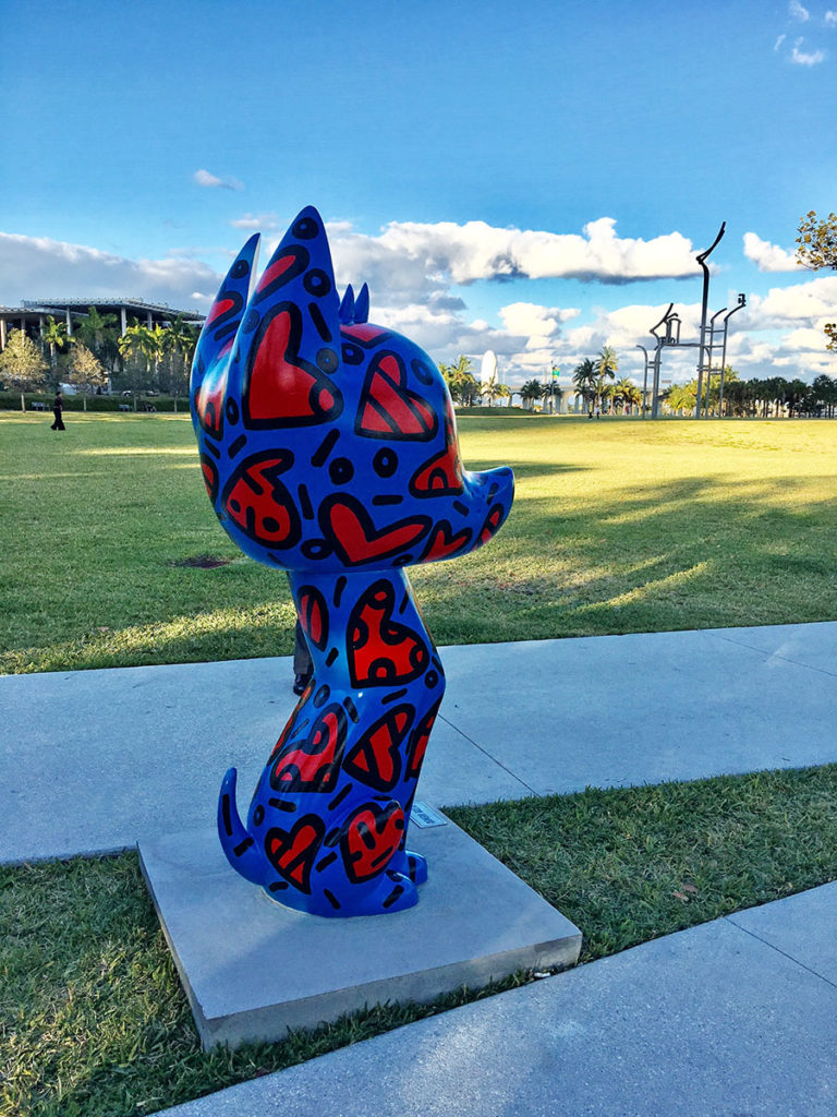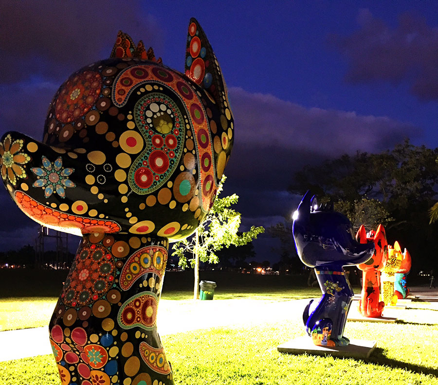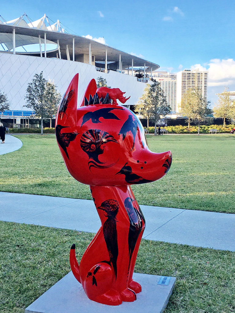 La colección de esculturas gigantes de perros prehispánicos xoloitzcuintles se encuentran en Bayfront Park de Miami, frente al Pérez Art Museum Miami.