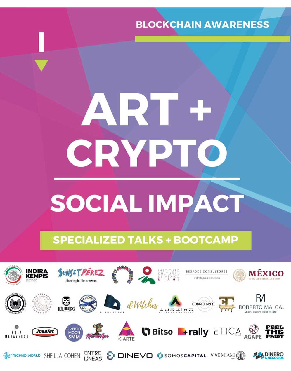 El evento estuvo dirigido por su host Sunset Pérez, artista visual buena vibra, quien presentó durante 2 días charlas especializadas y un Boot Camp con expertos en el tema de Arte, Crypto y su impacto en la sociedad.